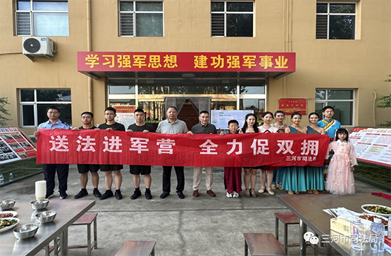 在中国人民解放军建军96周年来临之际,三河市司法局携手常乐爱心艺术团共赴武警廊坊支队执勤二大队三河中队开展“送法进军营 全力促双拥”普法宣传活动,向武警战士送上节日的祝福和法治的关怀,营造了军爱民、民拥军的深厚氛围,巩固发展了军政军民关系。