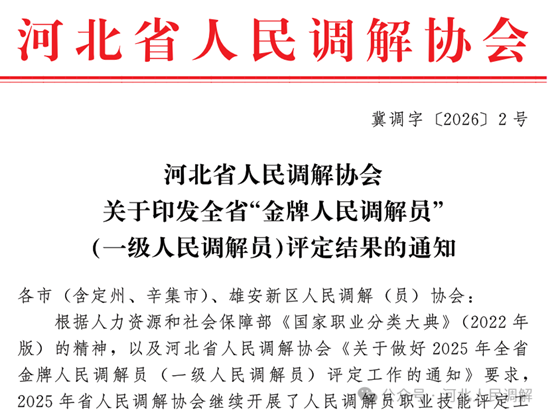 揭晓 100名全省金牌调解员 去年三月,河北省人民调解协会以冀调字【2025】1号文印发通知,安排部署2025年度全省百名金牌人民调解员(一级人民调解员)申报评定工作。经过个人申报、逐级审核、专家评定和结果公示等环节,至2026年2月15日,全省第三批百名金牌人民调解员(一级人民调解员)评定走完所有程序后揭晓结果,协会印发《全省“金牌人民调解员”(一级人民调解员)评定结果的通知》予以公布。 通知文件指出,根据人力资源和社会保障部《国家职业分类大典》(2022年版)的精神,以及河北省人民调解协会《关于做好2025年全省金牌人民调解员(一级人民调解员)评定工作的通知》要求,2025年省人民调解协会继续开展了人民调解员职业技能评定工作,评出100名全省金牌人民调解员(一级人民调解员)。希望被评定的全省金牌人民调解员继续加强法律政策和职业技能学习,提升依法解决矛盾纠纷的能力,提高调解技能技巧,在基层法治建设和矛盾纠纷多元化解中发挥更大作用。 附:2025年全省第三批 金牌调解员名单 石家庄市(15人) 张红茹 石家庄道路交通事故损害赔偿人调解委员会 调解员 刘进卿 晋州市疑难纠纷人民调解委员会 调解员 刘风海 石家庄市鹿泉区疑难纠纷人民调解委员会 主任 王素然 新乐市婚姻家庭人民调解委员会 调解员 王进忠 深泽县铁杆镇人民调解委员会 调解员 李延旭 石家庄市新华区西苑街道人民调解委员会 副主任 高亚东 元氏县姬村镇人民调解委员会 主任 高艳 石家庄市裕华区东苑街道东一社区人民调解委员会 副主任 吴月洪 石家庄市藁城区系井社区人民调解委员会 主任 刘丽丽 石家庄市井陉矿区矿石街道皇冠苑社区调委会 主任 段利强 灵寿县灵寿镇东托村人民调解委员会 主任 李鹏龙 平山县东回合镇东回合村人民调解委员会 主任 曹振国 行唐县安香乡常香村人民调解委员会 主任 尹力献 赞皇县南清河乡北清河村人民调解委员会 调解员 张庆海 正定县新城铺镇新城铺村人民调解委员会 主任 张家口市(6人) 徐佃锋 蔚县信访事项人民调解委员会 主任 王韩利 张家口市综合人民调解委员会 调解员 张成成 张家口市崇礼区清三营乡人民调解委员会 调解员 高连胜 张家口市下花园区花园乡人民调解委员会 调解员 侯 耀 阳原县三马坊乡人民调解委员会 调解员 刘虹丽 张家口市桥西区南新村社区人民调解委员会 调解员 承德市(9人) 贾玉坡 兴隆县安子岭乡人民调解委员会 副主任 金大雨 承德县六沟镇人民调解委员会 副主任 李胜银 平泉市平泉镇人民调解委员会 副主任 孙晓慧 隆化县安州街道西新社区人民调解委员会 调解员 徐建鑫 滦平县小营镇人民调解委员会 副主任 杨阳 围场满族蒙古族自治县大唤起乡大八号村调委会 主任 董晓娜 承德市鹰手营子矿区铁北路街道桥西社区调委会 主任 杜向荣 承德市双滦区元宝山街道御祥园社区调委会 调解员 吕文广 丰宁满族自治县石人沟乡宽沟村调委会 主任 秦皇岛市(5人) 曹苏宁 秦皇岛市人民调解中心 主任 沙秀敏 秦皇岛市消费纠纷人民调解委员会 主任 石连宝 卢龙县重大疑难民间纠纷人民调解委员会 主任 张 虎 青龙满族自治县双山子镇瓦房村人民调解委员会 调解员 张少良 青龙满族自治县祖山镇西河村人民调解委员会 主任 唐山市(8人) 魏瑞雪 滦南县道路交通事故一体化人民调解委员会 调解员 黄志民 唐山市丰南区柳树瞿镇人民调解委员会 调解员 王剑斌 遵化市娘娘庄镇人民调解委员会 主任 刘颖 迁安市木厂口乡人民调解委员会 副主任 于圆 唐山市曹妃甸区第五农场人民调解委员会 主任 刘文静 唐山市路南区小山隆义里社区人民调解委员会 主任 王文 迁安市大五里镇尚庄子村人民调解委员会 主任 王晓阳 遵化市化明路街道华西社区人民调解委员会 主任 廊坊市(5人) 苏秋竹 廊坊市医疗纠纷人民调解委员会 调解员 耿振江 霸州市医疗纠纷人民调解委员会 主任 马瑞 文安县互联网金融纠纷调解中心 主任 石竟民 廊坊市广阳区解放道街道人民调解委员会 副主任 苍涛 永清县龙虎庄乡前店村人民调解委员会 主任 保定市(9人) 孙月学 涿州市交通事故人民调解委员会 调解员 陈同喜 唐县心连心人民调解委员会 主任 刘宗峰 定兴县劳动纠纷人民调解委员会 调解员 姜峰 定兴县内章镇人民调解委员会 调解员 付松坡 博野县城东镇里村人民调解委员会 主任 赵俊林 阜平县北果园镇革新庄村人民调解委员会 主任 杨美侠 高碑店市和平街道汇佳社区人民调解委员会 主任 李拴 彝县北郭丹镇武家营村人民调解委员会 主任 魏国洪 高碑店市白沟新城团结路社区人民调解委员会 副主任 沧州市(7人) 杨宝兴 泊头市家具行业纠纷人民调解委员会 主任 况兴驰 沧州市医疗纠纷人民调解委员会 副主任 李德华 献县十五里镇人民调解委员会 调解员 刘恩昌 青县清州镇人民调解委员会 副主任 郭京瑞 任丘市新华路街道万丰社区人民调解委员会 副主任 李铁林 泊头市鼓楼跃进社区人民调解委员会 主任 张俊荣 南皮县六八里镇八里台村人民调解委员会 主任 衡水市(7人) 王 丽 衡水市婚姻家庭纠纷人民调解委员会 主任 郭 琳 衡水市桃城区医疗纠纷人民调解委员会 副主任 王爱民 阜城县古城镇人民调解委员会 主任 李向平 衡水市冀州迎宾社区人民调解委员会 调解员 顾中宁 枣强县嘉会镇