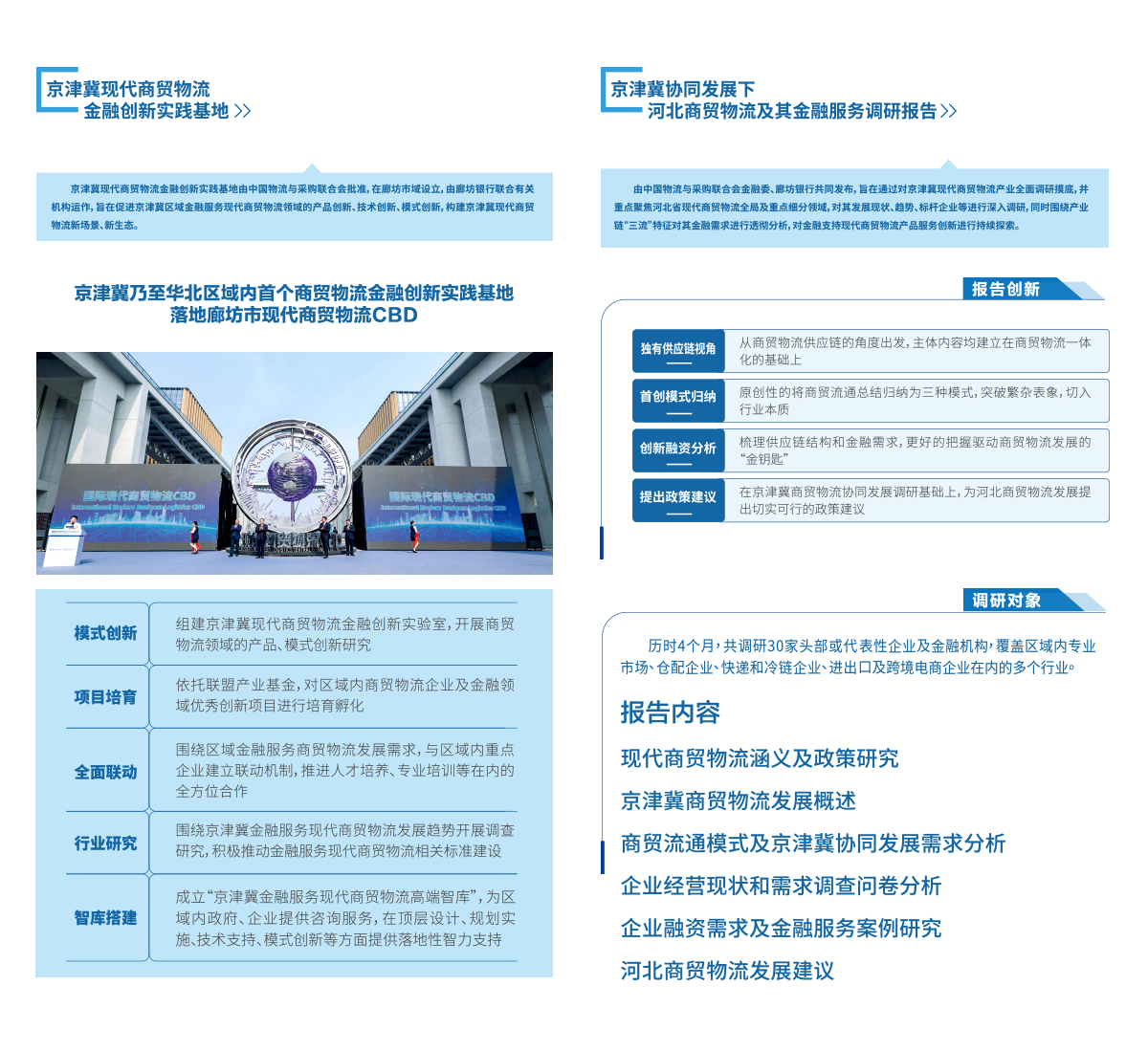 据介绍,这是京津冀金融服务现代商贸物流方面首个权威调研报告。《报告》通过解读商贸物流相关政策、分析京津冀商贸物流发展现状、分析商贸物流融资需求等,为区域商贸物流发展提供建议,对金融支持现代商贸物流产品服务创... 详细>>